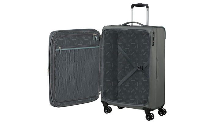 - 100 % hmotnosti vnútornej výstelky, rozšíriteľnosti a zipsov je vyrobených z recyklovaného PET plastu s použitím 9 recyklovaných fliaš s objemom 500 ml.