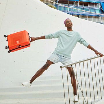 Dvojité kolieska pre vysokú stabilitu a hladkú jazdu na všetkých povrchoch. Ergonomická vstavaná horná a bočná rukoväť na prenášanie